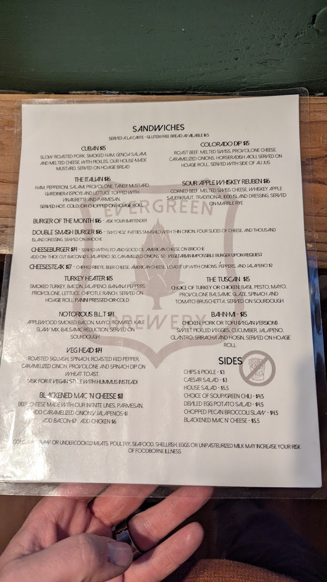 For those looking for a lighter option, the salad selection includes options like the Thai Crunch Salad and Harvest Apple Salad, showcasing a mix of fresh ingredients and bold dressings. The sandwiches at Evergreen Brewery are a must-try, with options like the Cuban Sandwich and Sour Apple Irish Red Reuben standing out as fan favorites.
